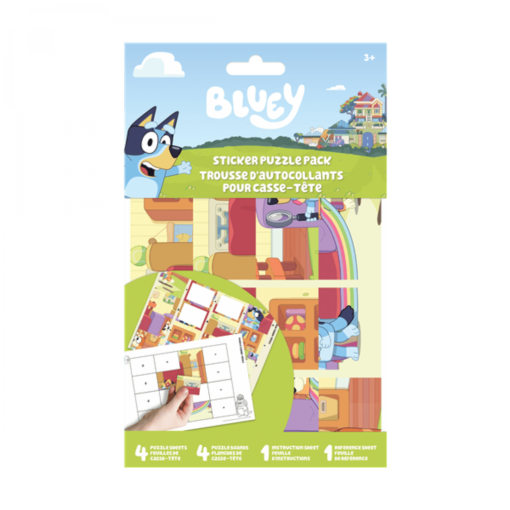 Officially licensed Bluey - Bandit and Chilli Adventures Puzzle Sticker Pack. This Bluey Sticker Pack measures 5.82 x 8.97 and includes four Bandit and Chilli Adventures puzzle sheets, one instruction sheet, one puzzle thumb nail sheet, and two puzzle sheets (front and back use). Made from paper and conveniently travel-sized.