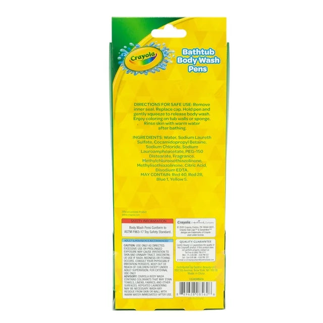 Includes 5 Crayola Body Wash Pens in multiple colors and a soft terry wash cloth