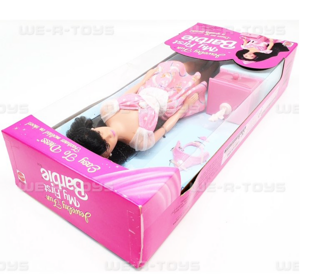 This 1996 Mattel "Jewelry Fun My First Barbie Doll" (#16008) is a collectible in near-retail, never-finished-box (NRFB) condition, preserving its original charm. Designed for beginners, this Barbie invites young collectors to explore simple jewelry play, enhancing fine motor skills and creativity. Its vintage status makes it a valuable addition for enthusiasts and those seeking a nostalgic connection to classic Barbie dolls from the 90s.